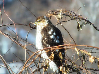This fellow has a sharp eye and catches my birds. You can tell when he is around the birds make an exit and wait until he is gone. Sometimes it is hours. One day a squirrel almost ran into him on the ground that would have been a sight to see, not sure who would have won that battle